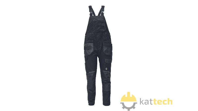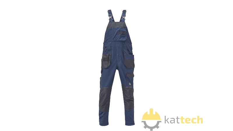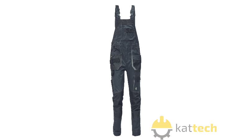 Męskie ogrodniczki robocze wykonane z elastycznej, innowacyjnej tkaniny TRIFIBETEX - ergonomiczne dopasowane, a do tego elastyczny tył w pasie. Trwałe potrójne szwy w wybranych miejscach i wzmocnienia na kolanach z możliwością włożenia nakolanników. Przestronna, wielofunkcyjna przednia kieszeń z taśmą na narzędzia, 2 kieszenie tylne z klapą i wzmocnieniem z tkaniny Oxford, kieszeń udowa na telefon z klapką na rzep, funkcjonalne kieszenie na akcesoria (np. miara, nóż), pętelka na młotek i pas na narzędzia w talii, pierścień D-ring, rozporek kryty plisą, odblaskowe elementy ton w ton, możliwość wydłużenia.