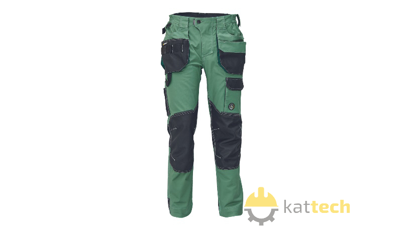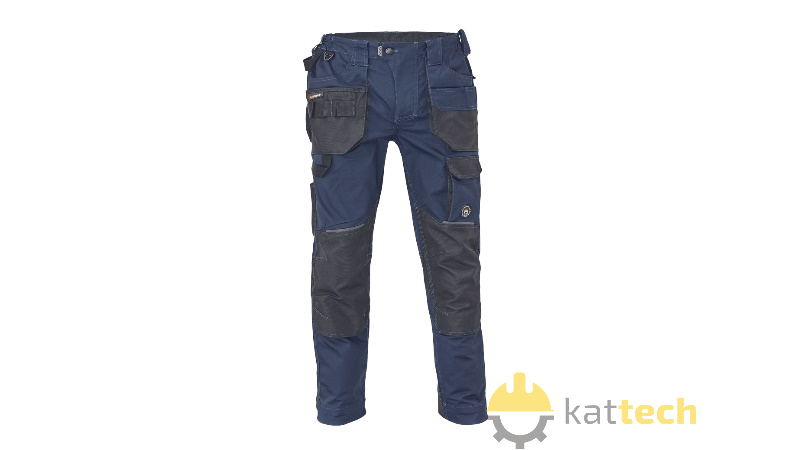 Męskie spodnie robocze wykonane z elastycznej innowacyjnej tkaniny TRIFIBETEX® - do tego ergonomiczne dopasowanie i niski stan trwałe potrójne szwy wzmacniające wytrzymałość w określonych miejscach wzmocnienia na kolanach z możliwością włożenia nakolanników przestronna, wielofunkcyjna przednia kieszeń z taśmą na narzędzia, 2 kieszenie tylne z klapą i wzmocnieniem z tkaniny Oxford, kieszeń udowa na telefon z klapką na rzep, funkcjonalne kieszenie na akcesoria (np. miara, nóż), pierścień D-ring, pas na narzędzia w talii.