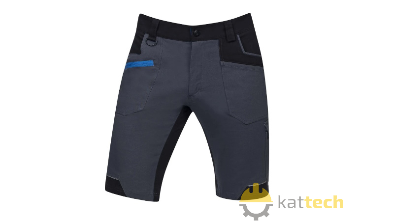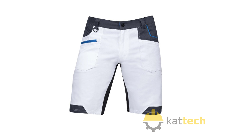 w wielofunkcyjną kieszeń na prawej nogawce na miarkę stolarską, nóż bezpieczny i śrubokręt. Na lewej nogawce znajduje się duża podwójna kieszeń zakryta patką, na której można umieścić własne logo, tak samo w części tylnej spodenek. Zwiększoną widoczność użytkownika zapewniają taśmy odblaskowe umieszczone z przodu i z tyłu oraz akcesoria hi-vis.