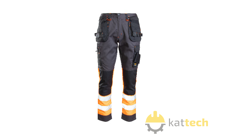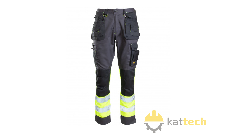 Spodnie wykonane z wysokiej jakości materiału, który nawet po wielokrotnym praniu zapewnia stabilność rozmiarów i kolorów. Posiadają podwójne taśmy odblaskowe o właściwościach fluorescencyjnych, wstawki kolorystyczne, kontrastowe ryglówki oraz podwójne i potrójne szwy, szyte mocną nicią. Model ten wyróżniają również dwie kieszenie w tylnej części spodni, wzmocnione kieszenie boczne, kieszeń na komórkę, kieszeń na dokumenty, kieszeń na „metrówkę”, a także dwie chowane kieszenie monterskie i ergonomiczną kieszeń na nakolanniki. Duża ilość ryglówek w miejscach szczególnie narażonych na rozprucie. Spodnie posiadają również szlufki na pasek.