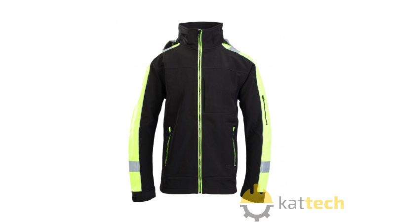 Kurtka softshellowa zapinana na zamek kostkowy ze wstawkami kolorystycznymi. Kieszeń na lewym rękawie, dwie kieszenie boczne, dwie wewnętrzne, kieszeń na klatce piersiowej, wszystkie zapinane na zamek. Rękawy zakończone mankietami z możliwością regulacji. Kaptur jest odpinany, regulowany i ocieplany.