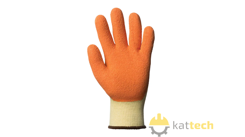 Rękawice bezszwowe z polistyrenu z pomarańczową lateksową powłoką po wewnętrznej stronie dłoni z marszczonym wykończeniem. Na mankietach znajduje się mały ściągacz dla lepszego dopasowania do dłoni