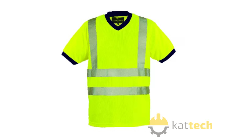 Koszulka odblaskowa ostrzegawcza o modnym kroju. Dekolt w kształcie literki V. Stworzona z materiału ripstop. Ten model ma wszyte fluorescencyjne pasy wokół klatki piersiowej i ramion.