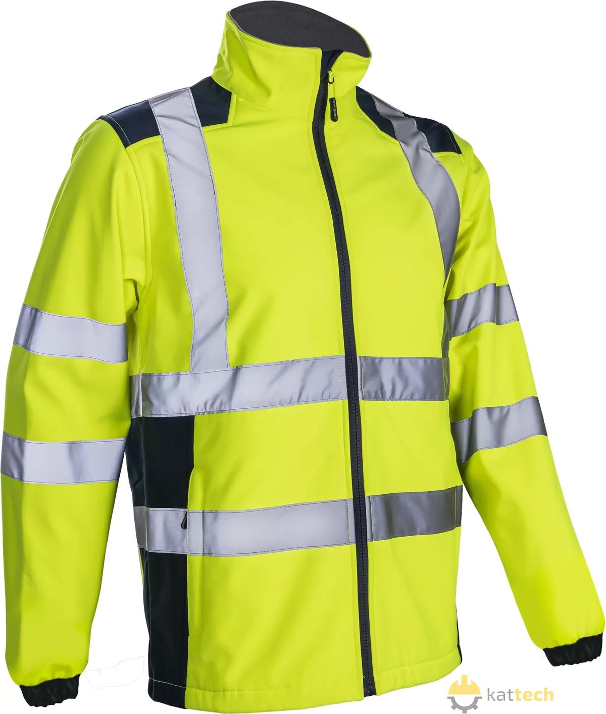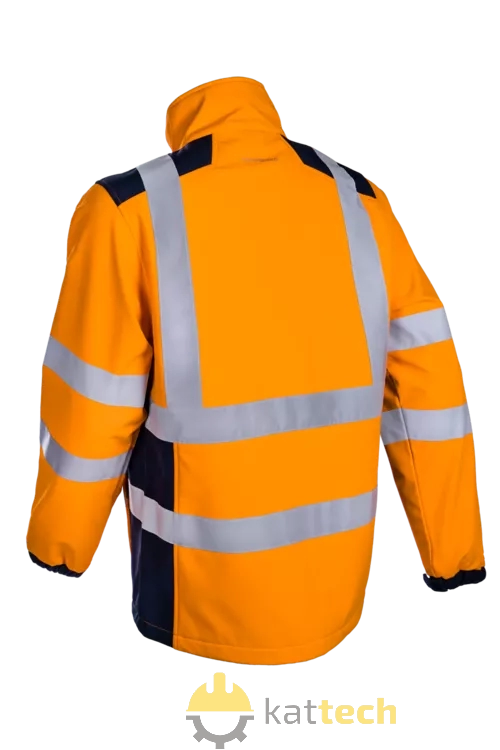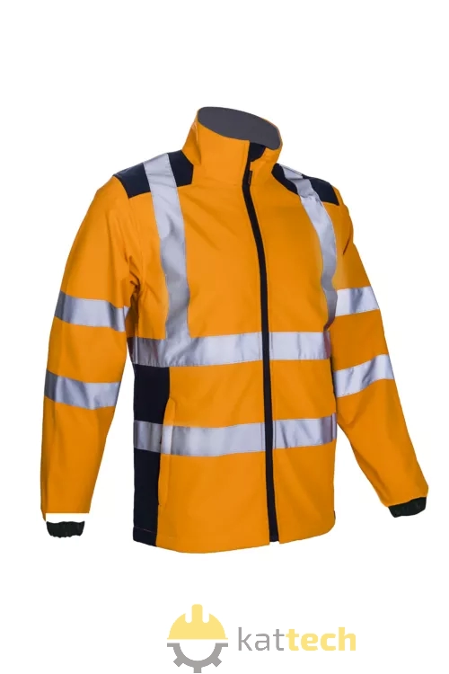 Kurtka softshell o wysokiej widoczności składa się z 3 warstw: poliestrowy stretch mechaniczny, membrana tpu, mikropolar. Posiadają wysoki kołnierz, osłonę podbródka i 2 elastyczne kieszenie zapinane na zamek. Kurtka posiada certyfikat widoczności klasy 2.