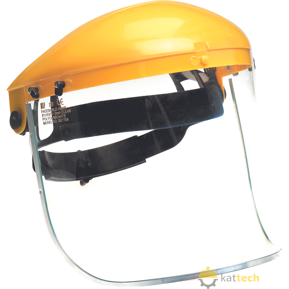Bezbarwna, poliwęglanowa osłona twarzy z uchwytem na głowę, poliwęglanowa szybka klasy 1B. Zgodne z normą EN 166.